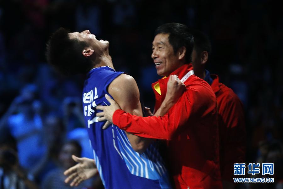 8月31日,中国选手谌龙(左)在决赛后与教练庆祝夺冠。当日,在丹麦哥本哈根巴勒鲁普超级体育馆举行的2014年世界羽毛球锦标赛男子单打决赛中,中国选手谌龙以2比0战胜马来西亚选手李宗伟,夺得冠军。新华社记者王丽莉摄