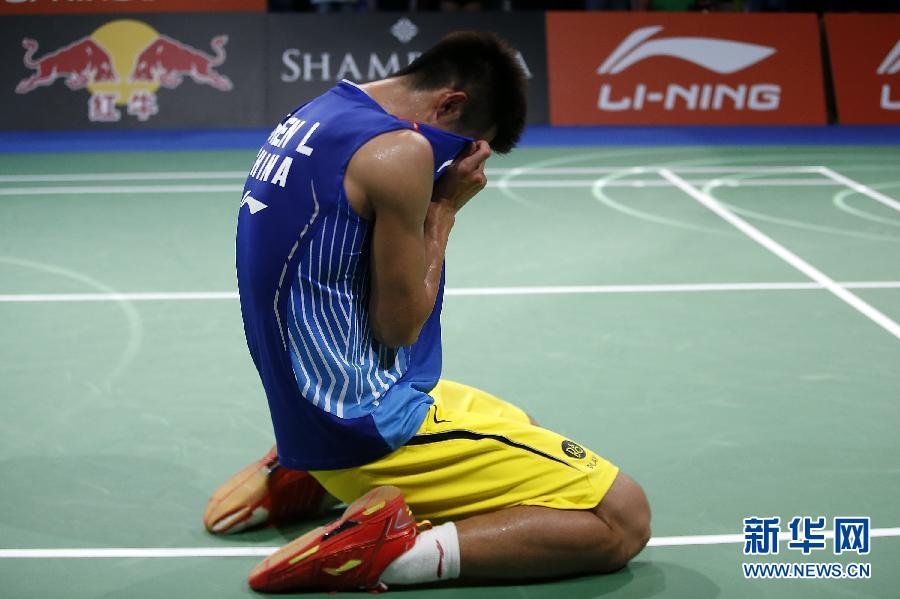 8月31日,中国选手谌龙在决赛后跪地庆祝夺冠。当日,在丹麦哥本哈根巴勒鲁普超级体育馆举行的2014年世界羽毛球锦标赛男子单打决赛中,中国选手谌龙以2比0战胜马来西亚选手李宗伟,夺得冠军。新华社记者王丽莉摄