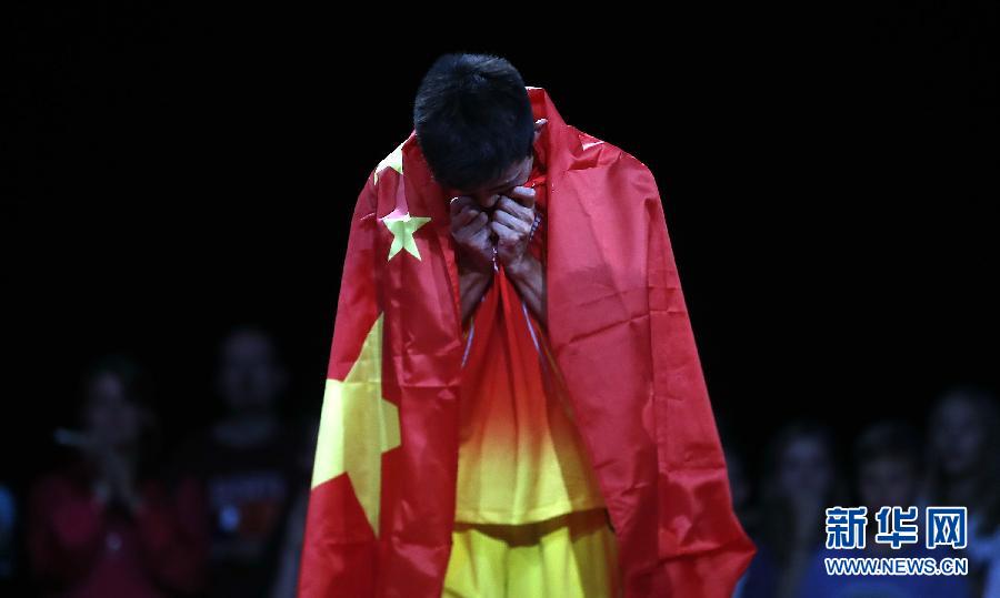 8月31日,中国选手谌龙在颁奖仪式上亲吻上衣胸前的国旗。当日,在丹麦哥本哈根巴勒鲁普超级体育馆举行的2014年世界羽毛球锦标赛男子单打决赛中,中国选手谌龙以2比0战胜马来西亚选手李宗伟,夺得冠军。新华社记者王丽莉摄