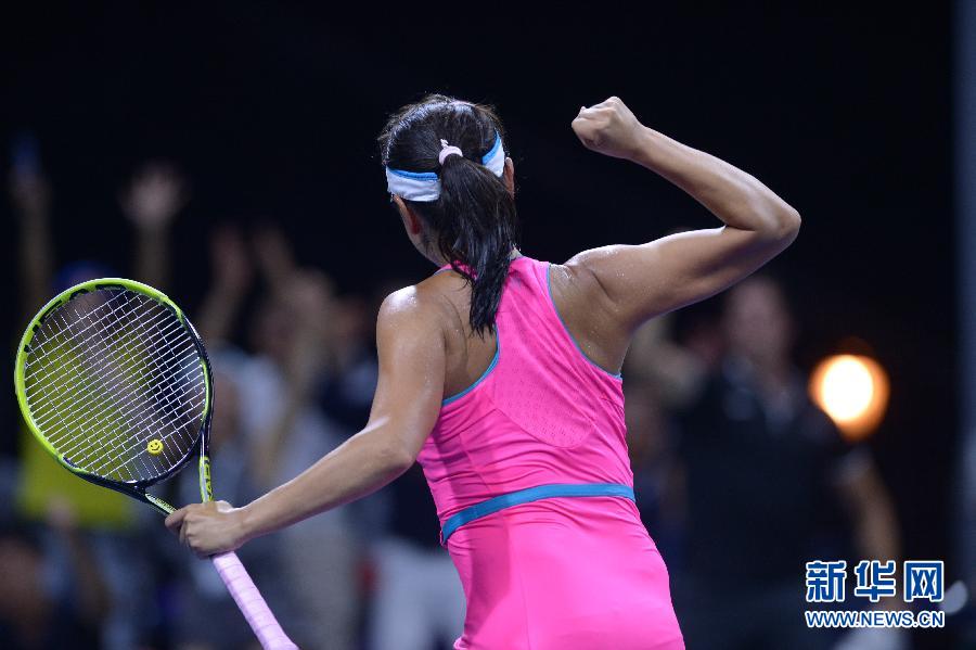 8月31日,彭帅在比赛中庆祝获胜。当日,在2014年美国网球公开赛女子单打第四轮比赛中,中国选手彭帅以2比0战胜捷克选手萨法洛娃,职业生涯首次闯入大满贯赛单打八强。新华社记者殷博古摄
