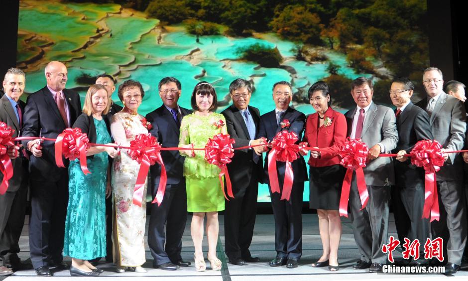 当地时间8月31日,“锦绣中华—藏区新貌”文化周在美国洛杉矶揭幕,文化周以图片展、歌舞表演和藏文化名家论坛等活动向人们呈现出四川藏区的真实面貌。中共四川省委常委、组织部长范锐平(右四)、美国联邦众议员赵美心(右三)、中国驻洛杉矶总领事刘健(右六)等为文化周活动剪彩。中新社发 毛建军 摄