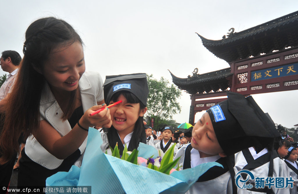 今天的夫子庙广场布置的特别漂亮,新生们的方阵声势浩大,不一会儿,随着学校民乐班同学演奏的悠扬乐曲,典礼开始了。晞晞在队伍里站的笔直,这样规模的活动她还是第一次参加。。“学而时习之,不亦说乎”大家一起摇头晃脑大声背诵,接着老师在每一位同学的额头上点上朱砂寓意开智。
