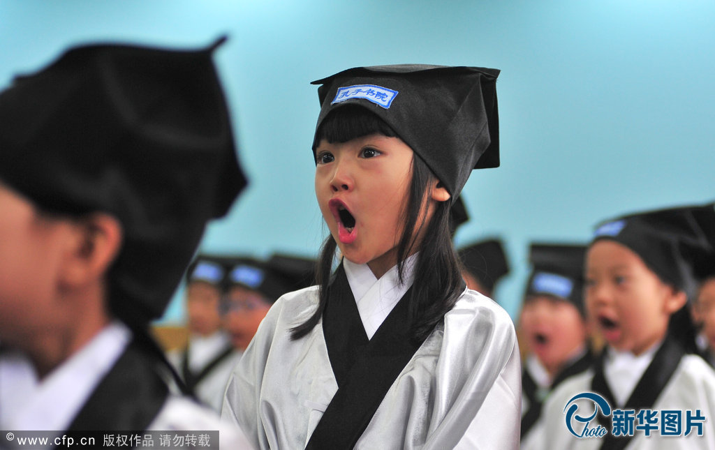 今天的夫子庙广场布置的特别漂亮,新生们的方阵声势浩大,不一会儿,随着学校民乐班同学演奏的悠扬乐曲,典礼开始了。晞晞在队伍里站的笔直,这样规模的活动她还是第一次参加。“学而时习之,不亦说乎”大家一起摇头晃脑大声背诵,接着老师在每一位同学的额头上点上朱砂寓意开智。