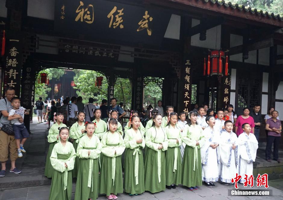 9月8日是中国传统佳节中秋节,身着传统汉服的20名“三国小学堂”学童,在老师带领下来到成都武侯祠,与游客们一起过佳节,推广传统文化。中新社发 武轩 摄