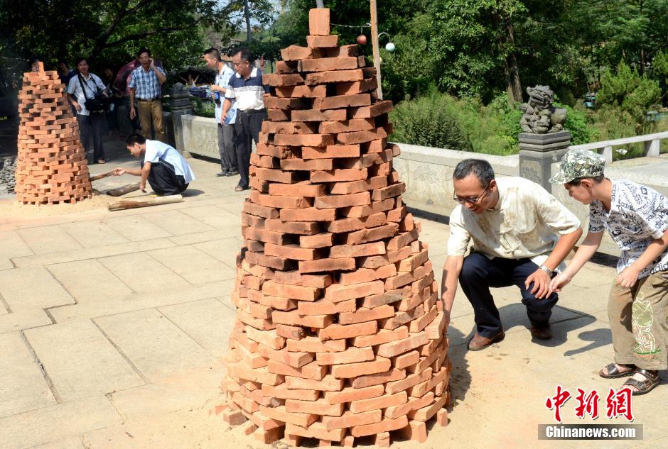 9月7日,以“古村摆塔、闽韵仲秋”为主题的中秋民俗活动在福州仓山“千年古村” 林浦村泰山宫点将台举行。活动现场,当地民众以豆蒿引火,送至事先用砖块和瓦片搭建而成的“品”字形塔口前,顿时该塔成为金光四射的的宝塔。据介绍,烧塔习俗是福州悠久的中秋摆塔习俗的一个重要组成部分,象征着生活红红火火、幸福美满。刘可耕 摄