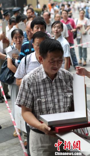图为《长江》邮票首发式现场,市民排起长龙等待陈铎老先生签名。 周毅 摄