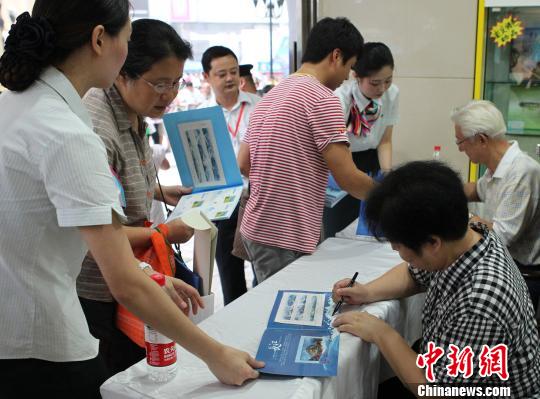 图为《话说长江》的著名主持人陈铎老先生亲临首发现场为购买邮票的市民签名。 周毅 摄