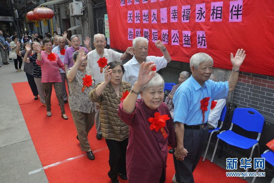 9月17日,老夫妻们结伴进入活动现场,并向邻里致意。当天,在上海市虹口区18街坊生活了几十年的20对“钻石婚”夫妻齐聚一处,用“红毯走秀”“吃蛋糕”等形式庆祝“钻石婚”,并向他们居住了几十年的老宅道别。据了解,这些结婚超过60年的老夫妻都在虹口区18街坊生活、相伴了几十年,他们中不少人都是该街坊的第一批居民。今年,18街坊所在的地块被列为了旧改动迁地块。随着居民们陆续乔迁,在社区的帮助下,老夫妻们以这样一种喜庆而难忘的方式告别旧居。新华社发(沈春琛 摄)