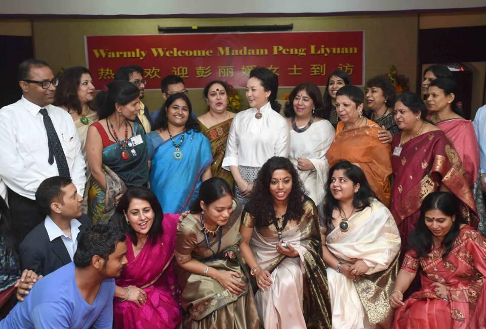 告别时,彭丽媛应邀和学校师生合影。彭丽媛同老师一一握手后说:“教师是很值得敬重的职业。我也是老师。”看到教孩子们学汉语、读唐诗的汉语教师唐光荣也在人群里,她笑着问:“你从哪里来?”唐光荣告诉彭丽媛:“从四川来的。”