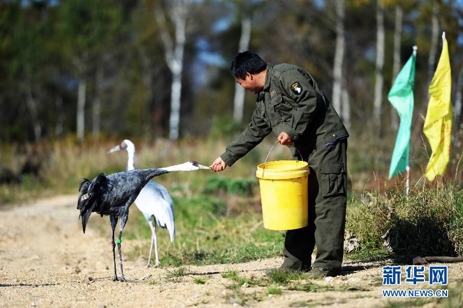 乌斯孟野生动物救助站饲养员张彬在野化训练后对白头鹤和白枕鹤喂食(9月19日摄)。 新华社记者 王凯 摄