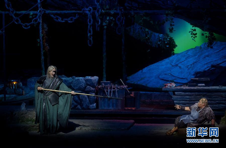 9月21日,演员表演歌剧《齐格弗里德》。当日,作为2014年国家艺术院团演出季参演剧目之一,中央歌剧院在北京国家大剧院首演瓦格纳歌剧《齐格弗里德》。《齐格弗里德》是瓦格纳根据古代北欧神话《尼伯龙根之歌》写成的作品《尼伯龙根指环》中的第三部,讲述了齐格弗里德历经重重磨难,最终夺取指环并收获爱情的曲折故事。新华社记者 金良快 摄