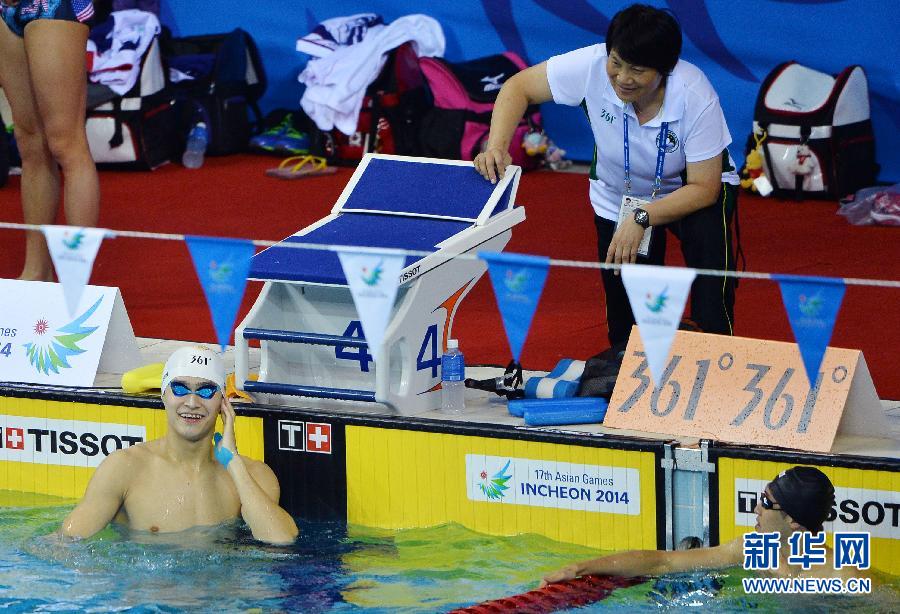 9月22日,中国选手孙杨(下左)在训练中。当日,2014仁川亚运会游泳比赛继续进行。 新华社记者朱峥摄