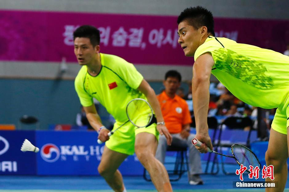9月23日,仁川亚运会羽毛球男子团体决赛在桂阳体育馆打响。中国队谌龙、徐晨/张楠分别告负,前两盘过后国羽0-2落后韩国。第三场林丹2-0横扫李东根为国羽吹响反攻的号角。第四场蔡赟/傅海峰(图)以2-1险胜金基正/金沙朗,将大比分扳平。中新社记者 富田 摄