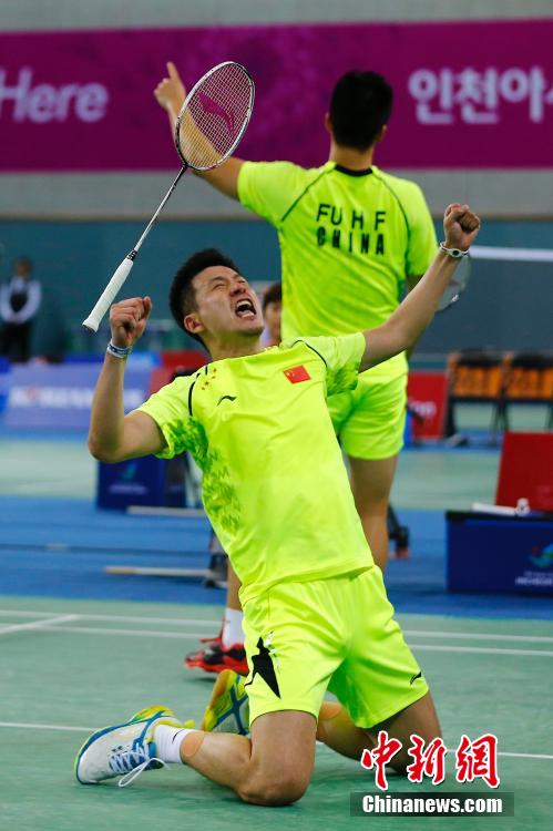 9月23日,仁川亚运会羽毛球男子团体决赛在桂阳体育馆打响。中国队谌龙、徐晨/张楠分别告负,前两盘过后国羽0-2落后韩国。第三场林丹2-0横扫李东根为国羽吹响反攻的号角。第四场蔡赟/傅海峰(图)以2-1险胜金基正/金沙朗,将大比分扳平。中新社记者 富田 摄