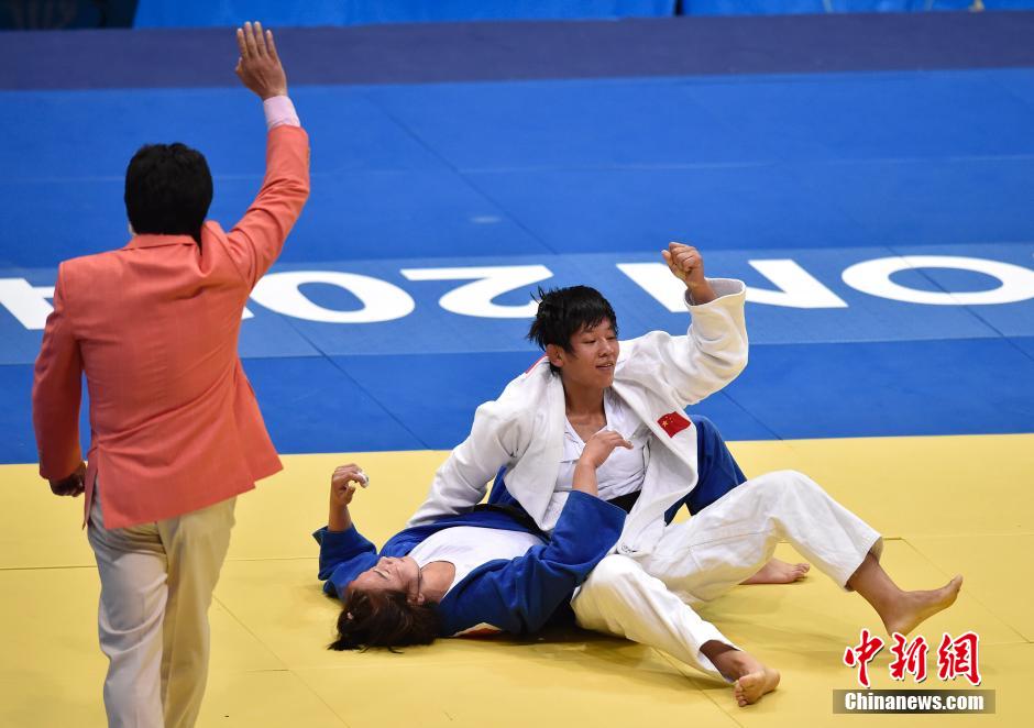 9月23日,第17届亚运会柔道团体比赛在韩国仁川市桃源体育馆举行。图为女子团体铜牌争夺战之一中国队(白)与蒙古队之间的争夺。中新社记者 侯宇 摄