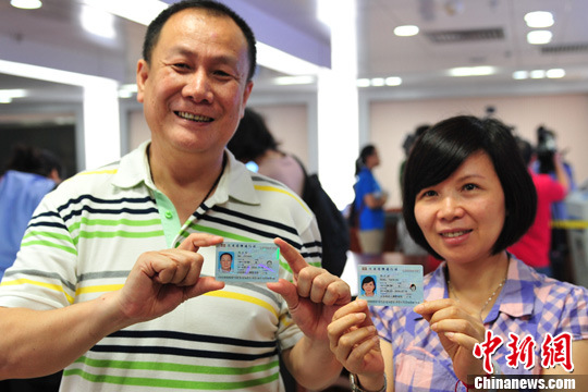 资料图:两位广州市民成功领取电子港澳通行证。中新社发 陈骥旻 摄