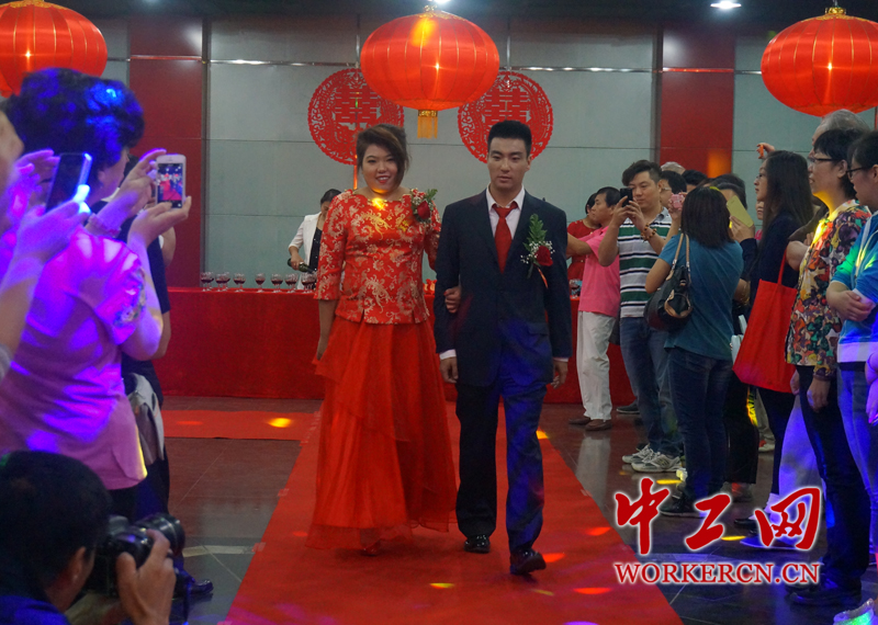 上周末,北京崇文工人文化宫广场幸福小剧场内欢声笑语,喜气洋洋,东城区总工会为10对新人举办了“情缘东城·幸福一生——2014年来京务工人员集体婚礼”。(中工网记者杨灵 摄)