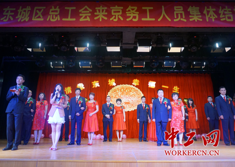 上周末,北京崇文工人文化宫广场幸福小剧场内欢声笑语,喜气洋洋,东城区总工会为10对新人举办了“情缘东城·幸福一生——2014年来京务工人员集体婚礼”。(中工网记者杨灵 摄)