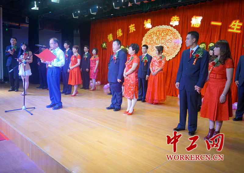 东城区领导主婚,工会主席证婚,还有新人亲友200多人一起见证他们的幸福时刻。(中工网记者杨灵 摄)