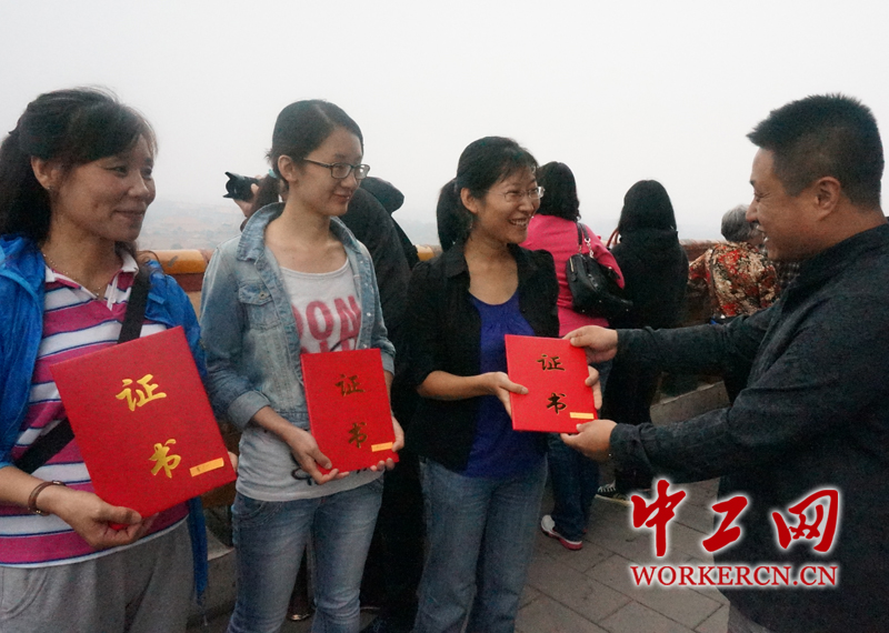 图为工会干部为前三名获奖者颁发证书。(中工网记者杨灵 摄)