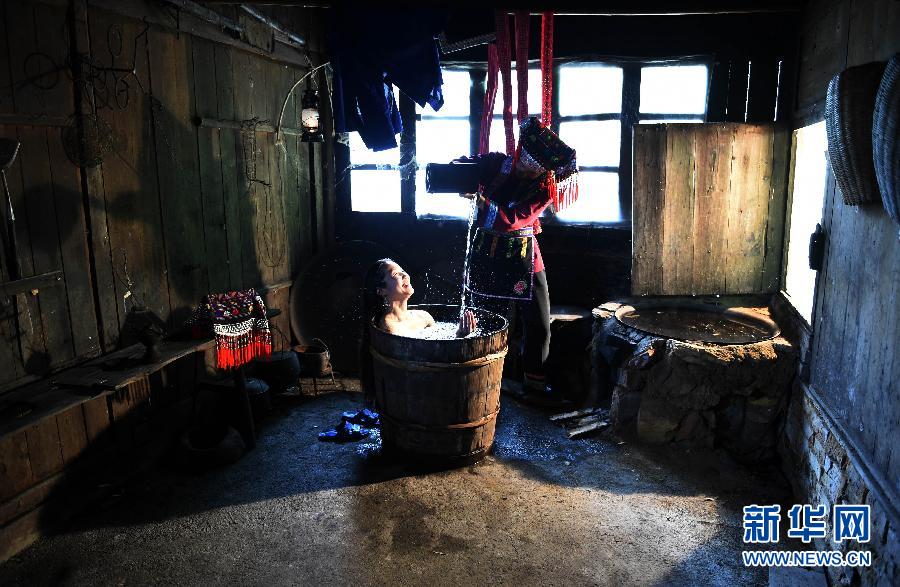 9月27日,在广西龙胜各族自治县龙脊镇大柳村,盘瑶妹子赵艳双(右)在给同伴黄晓青打药汤洗庞桶浴。庞桶浴是广西龙胜各族自治县盘瑶同胞一种独具特色的洗浴方式,这里的盘瑶将它作为祖先独创的保健养生秘方世代相传。据《龙胜县志》记载:“盘瑶有‘庞桶浴’之习,桶高2至3.5尺,直径2.5至3尺。洗时,用九牛藤、节骨草、血藤、钩藤等治风湿草药煮浓,兑冲成温汤,注入桶中供人沐浴,可去瘴气、风湿痛等”。因此,当地有这样的民谣,“天天洗个热水澡,不需郎中抓药草;常常蒸洗庞桶澡,消灾除病百年好”。新华社记者 陆波岸 摄