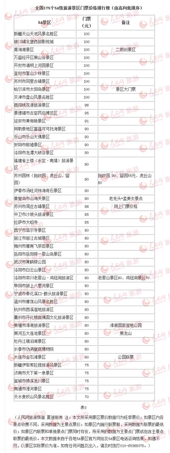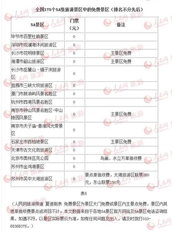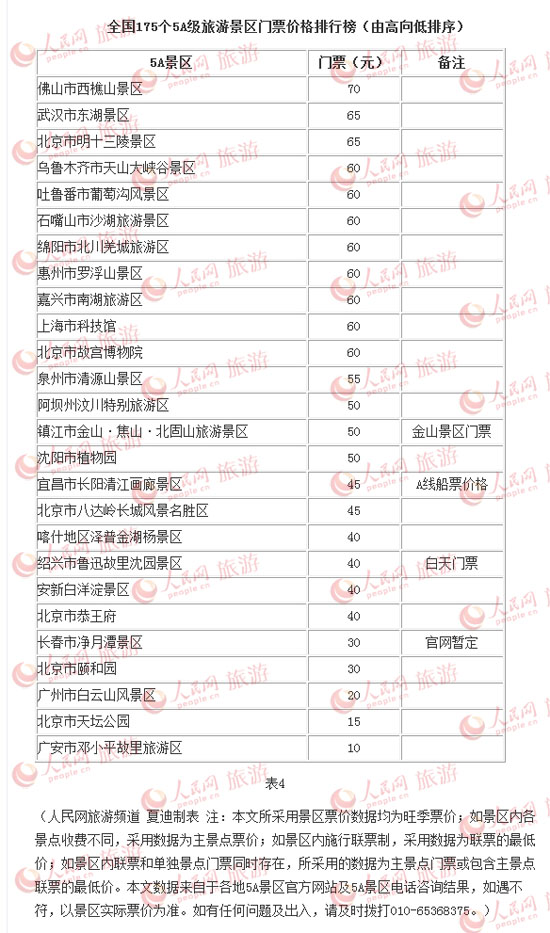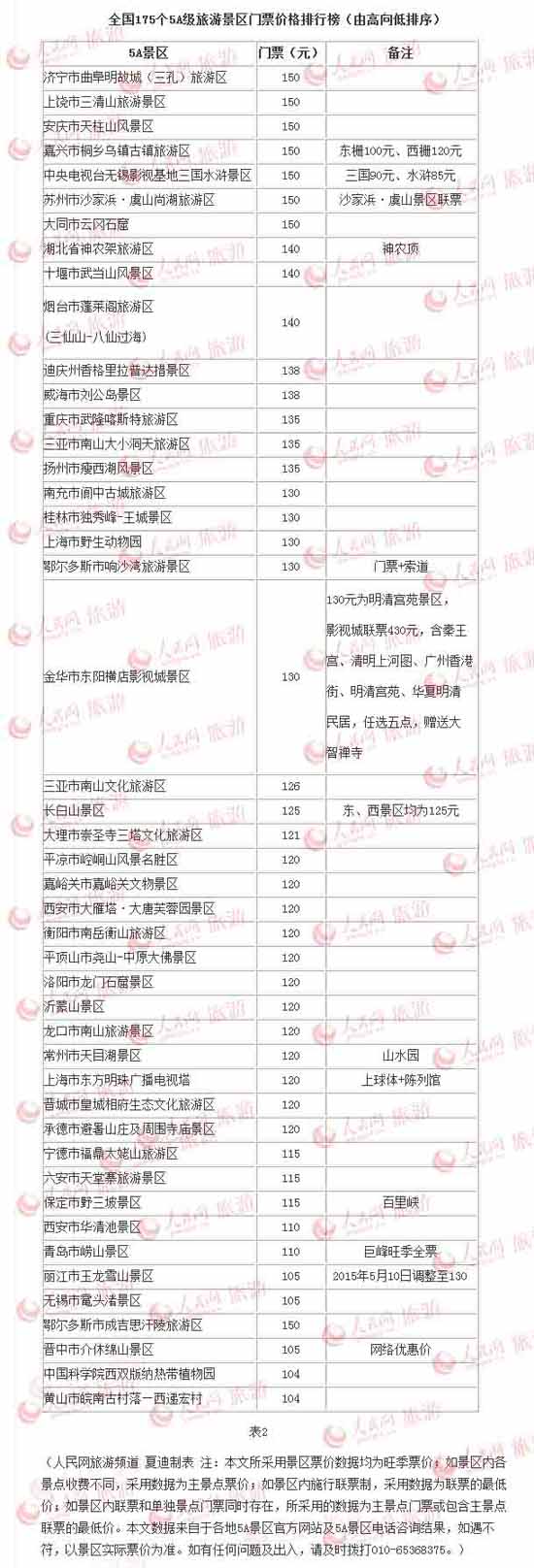(人民网旅游频道 夏迪制表 注:本文所采用景区票价数据均为旺季票价;如景区内各景点收费不同,采用数据为主景点票价;如景区内施行联票制,采用数据为联票的最低价;如景区内联票和单独景点门票同时存在,所采用的数据为主景点门票或包含主景点联票的最低价。本文数据来自于各地5A景区官方网站及5A景区电话咨询结果,如遇不符,以景区实际票价为准。如有任何问题及出入,请及时拨打010-65368375。)