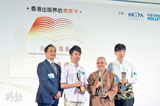 第一届香港金阅奖“我最喜爱作家”由读者一人一票选出,由邝俊宇(左二起)、衍阳法师及孤泣分别拿走铜奖、金奖和银奖。《明报》图