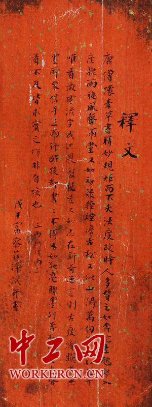 我第一次知道富察庄净先生的名字,是在1996年中国历史博物馆史树青先生办公室里,当时我约好前去采访史老的,中途又进来一位叫傅振起的中年男子,史老便给我介绍,说这位是富察庄净先生的公子。孤陋寡闻的我当时不知富察庄净何许人也?我便问史老,史老说,富察先生是当今少有的各体皆能的书法大家,不但字写得面貌独具,对书法教育的贡献也不是一般人所能比的。并建议我有机会给与关注宣传。就这样,我与富察庄净先生的公子傅振起互相留了电话。数日后,我按约走进位于月坛附近的一座普通居民楼,傅振起一家三口就住在一楼的一套两居室里。说话语速缓慢有时还有点儿停顿的傅先生,在众多子女中是伴随父亲抻纸研墨时间最久的一位,所以,在整个采访过程里,他总是流露出对父亲的那种深深怀念之情,这也是他打动我让我不能不动笔的动力之一。很快,我们便以兄弟相称了。1997年7月4日,我以《书坛巨笔——富察庄净先生》为题,将这次的采访文章发表。图为用放大镜才能看清的楷书释文(宽4.8厘米X高11.8厘米)。