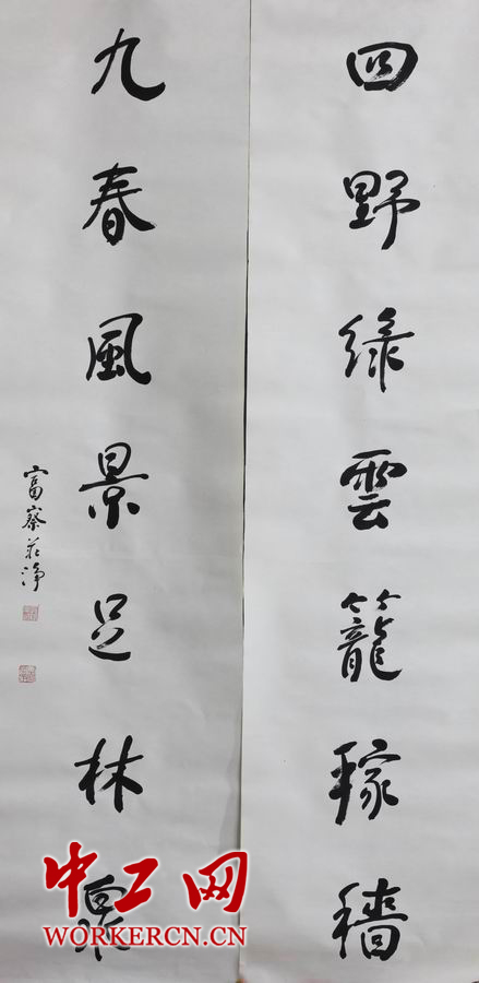 富察先生在我国书坛中居有重要地位,1918年出生的他,是清朝福康安郡王之后,自幼受家学影响,酷爱书法,并得名师指点。唐逊志、郑诵先等名家都是他相与切磋的好友。由此形成自己以圆笔为主、点画长短互用、顿挫跌宕、洒脱自然、清新朴茂的书法艺术风格。图为富察庄净对联作品。