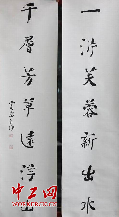 1986年,中共中央办公厅在中南海举办第一期书法班时,请富察先生去授课,听讲者中便有中央领导。富察先生对办学育人情有独钟,他不仅花精力还要出资金,把家藏古董和自身积蓄都拿出做了教学经费,即便这样,教学经费有时仍然难免捉襟见肘,每遇此时,他便会铺纸泼墨,将卖字钱予以填补。此外他是很少卖字的。他最重要的书法成果有《十二体百家姓》,由于自幼勤习隶、颜、欧、苏、黄、赵、瘦金诸体,兼及陈宝琛、何绍基、晋人写经、魏碑,故其大小楷书、行楷均十分精炼,因而成了收藏家们寻觅的书法精品,尽管他的字一字千金,润笔昂贵。图为富察庄净对联作品。