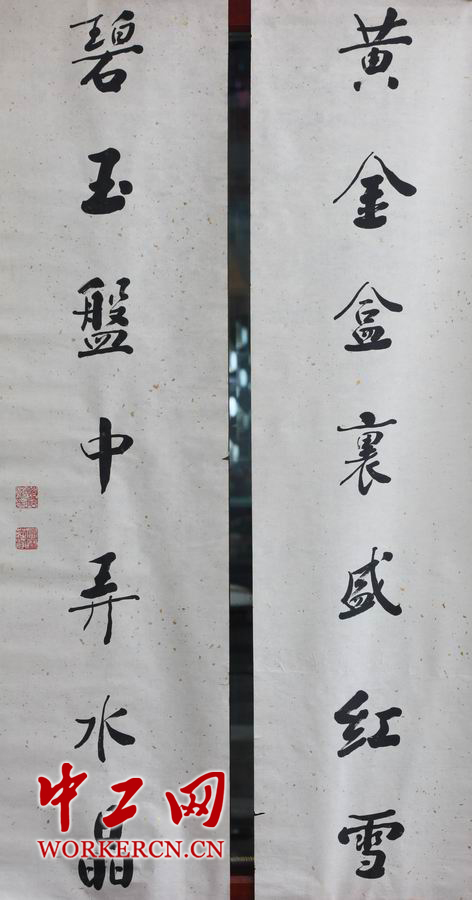 时间到了2014年4月,我又见到了振起兄,才几年不见,他不但能写,还擅绘画,且表现不俗。他说过去几十年受父亲耳濡目染,近几年才能够专心笔墨。得知我再次欲深入了解富察庄净先生书法艺术,他很感动,不嫌麻烦地努力找寻父亲那些久被尘封的珍贵资料与记忆,给我的写作提供史料依据。在他记忆里,父亲是位非常勤奋知识渊博的人,儿时就随父亲经常出入故宫博物院饱览历代书画真迹,回到家里,父亲便背临,他则在一旁给研磨,时常研着研着就趴在书案上睡着了。为补贴家用,父亲多次应邀给故宫写书法,那个时候(上世纪50年代)每个字才5分钱;还曾应邀给故宫画古代四大发明家的设色人物画。父亲告诉他,画画首先要打好书法基础,否则是画不出好画的。现在回想父亲的话,自己因为有了实践,体会更加深刻。父亲喜欢写一些名言警句挂在墙上教育他们,振起最受益的是“保剑锋从磨砺出,梅花香自苦寒来”这句,而且父亲就是身体力行的榜样。图为富察庄净对联作品。