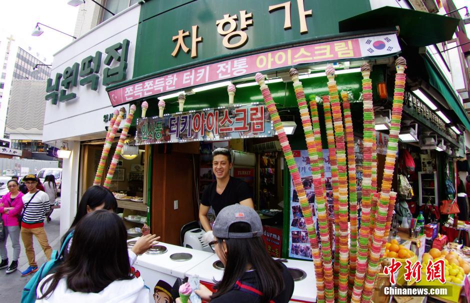 仁寺洞位于韩国首尔的城市中心,是一个有着悠久历史的商业街区。仁寺洞以大道为中心,两侧分布着许多胡同,形似迷宫。这里汇集了画廊、传统工艺店、古代美术店、传统茶店等。图为一位冰淇淋店老板正在招揽顾客。中新社发 贾天勇 摄