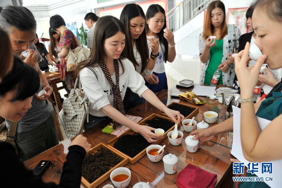 10月12日,评委在对参赛红茶的香气、滋味进行评分。当日,由广西茶叶学会举办的2014年广西红茶擂台赛在南宁金桥茶叶城举行,来自广西49家知名茶叶生产企业选送的红茶产品参加了外形、汤色、香气、滋味、叶底等五个方面的比拼。新华社发(喻湘泉 摄)