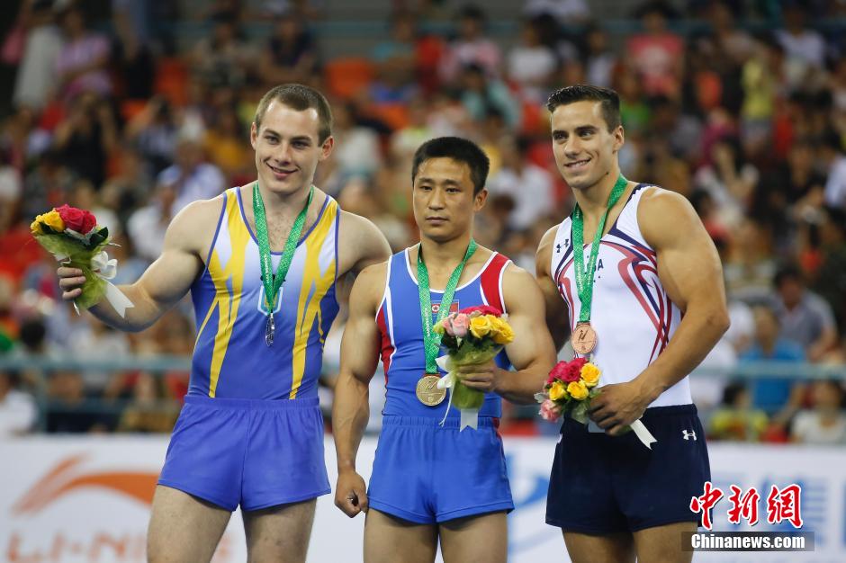 10月12日,第45届体操世锦赛男子跳马决赛在广西南宁结束, 朝鲜选手李思光(RI Se Gwang)夺冠,乌克兰选手伊哥-拉迪维洛夫(RADIVILOV Igor)、美国选手雅各布-达尔顿(DALTON Jacob)分获二、三名。中新社发 盛佳鹏 摄