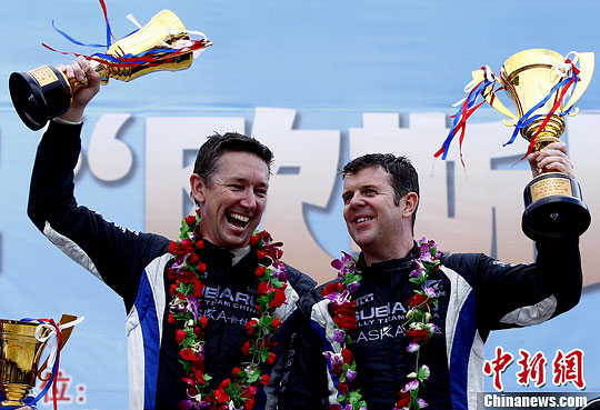 2014“欧斯塔克”杯湖南·汝城中国汽车拉力锦标赛10月12日落幕,来自国内的70多辆赛车参加本站比赛,斯巴鲁中国拉力车队英国籍车手马克-希金斯(右)与领航员卡尔-威廉姆森夺得全场冠军。赵振清 摄