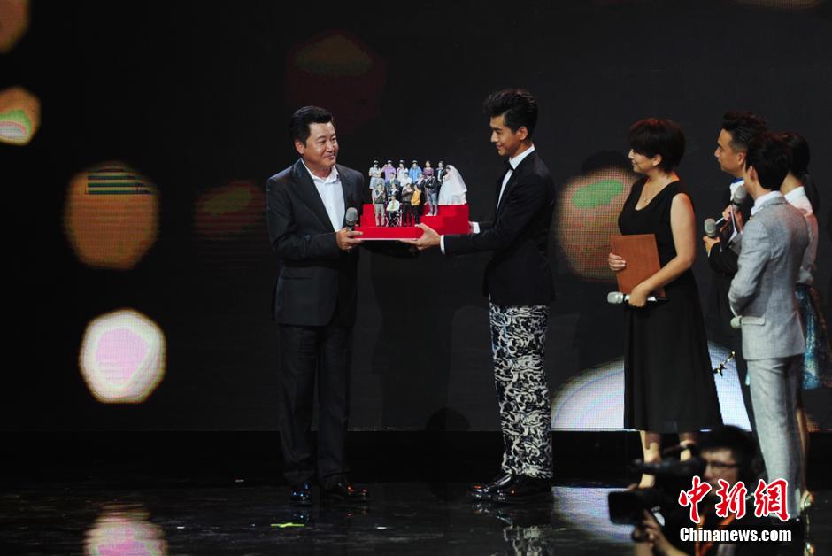 乔振宇为赵宝刚导演(左)赠送礼品。杨华峰 摄