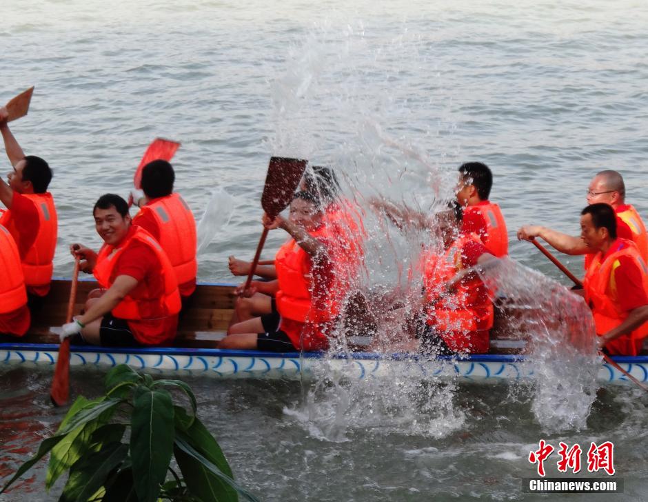 10月11日,达州市宣汉县君塘镇洋烈新村,四川首届农民艺术节上的新农村龙舟大赛正在举行。来自多个地区共20支由村民组成的代表队参加了这一“男子23人制500米直道竞速标准龙舟竞赛”。经过近2小时角逐,宣汉县君塘镇洋烈新村龙舟队斩获此次大赛冠军。中新社发 邓良奎 摄