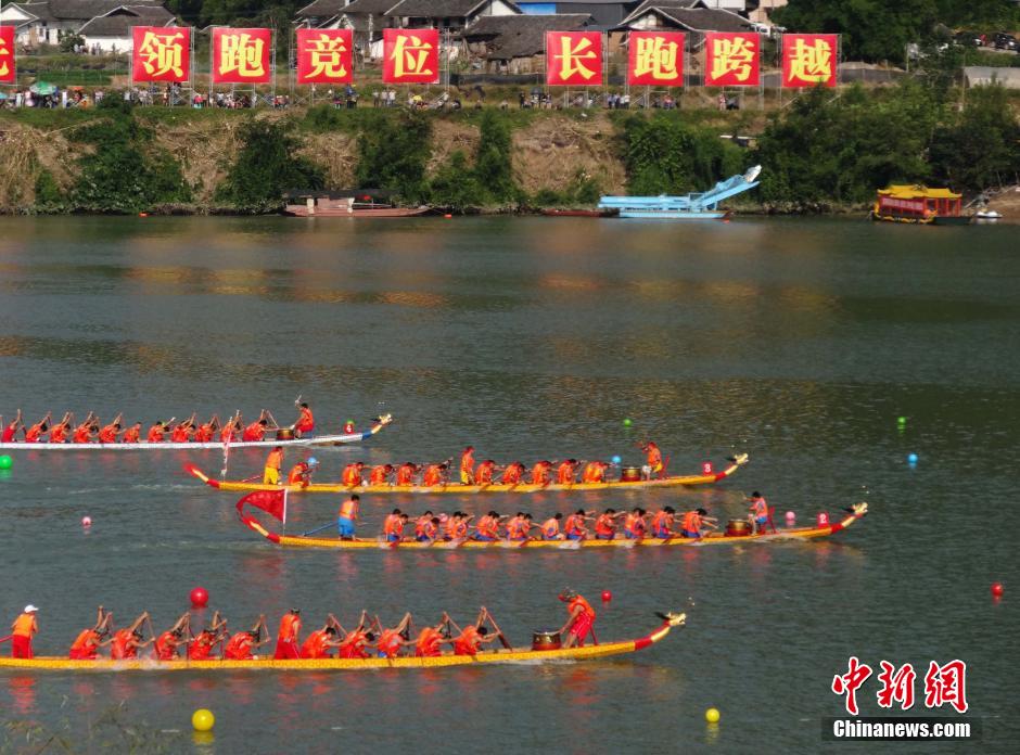 10月11日,达州市宣汉县君塘镇洋烈新村,四川首届农民艺术节上的新农村龙舟大赛正在举行。来自多个地区共20支由村民组成的代表队参加了这一“男子23人制500米直道竞速标准龙舟竞赛”。经过近2小时角逐,宣汉县君塘镇洋烈新村龙舟队斩获此次大赛冠军。中新社发 邓良奎 摄