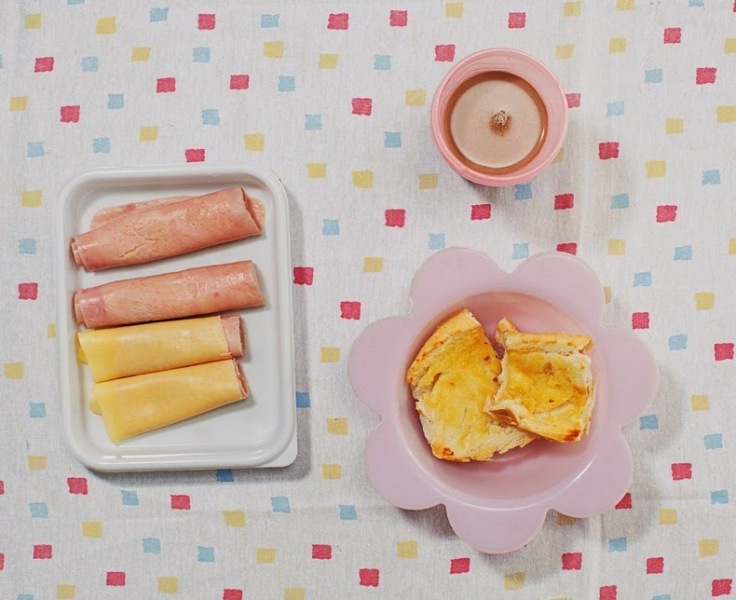 巴西圣保罗,4岁的阿丽希亚-多蒙妮卡和2岁的弟弟哈金姆-乔戈-弗莱拉-戈麦斯的早餐,其中包括火腿、奶酪以及抹有黄油的面包。