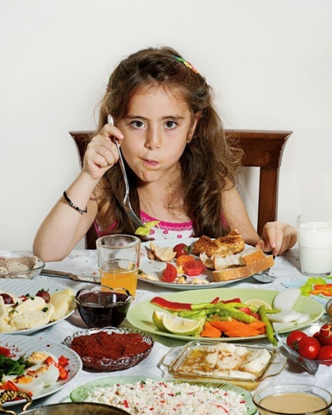 伊斯坦布尔,8岁的小女孩多嘉正在享用早餐。她的早餐非常丰盛,包括抹有蜂蜜和凝脂奶油的烤面包片、黑橄榄和绿橄榄、搭配辣肠的煎蛋、黄油、煮鸡蛋、搭配芝麻酱的浓葡萄露、羊奶和牛奶干酪、温柏和黑莓果酱、酥皮糕点和面包、西红柿、黄瓜、白萝卜和其他蔬菜、烤红辣椒泥、甜点以及牛奶和橙汁。
