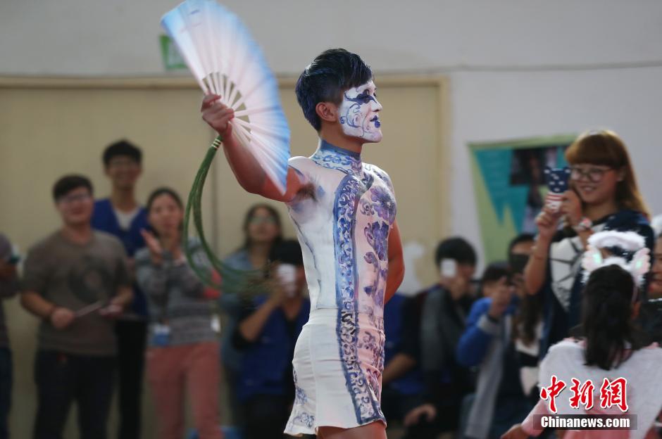 10月14日,参赛大学生在展示人体彩绘作品。当日,一场主题为“致青春”的人体彩绘艺术节在南京机电职业技术学院举行,来自该院的大学生们围绕雅致青春、绘致青春、缝致青春、梦致青春四个方面,通过在人体上彩绘出极具创意的图案,释放个性展现激情。中新社发 泱波 摄