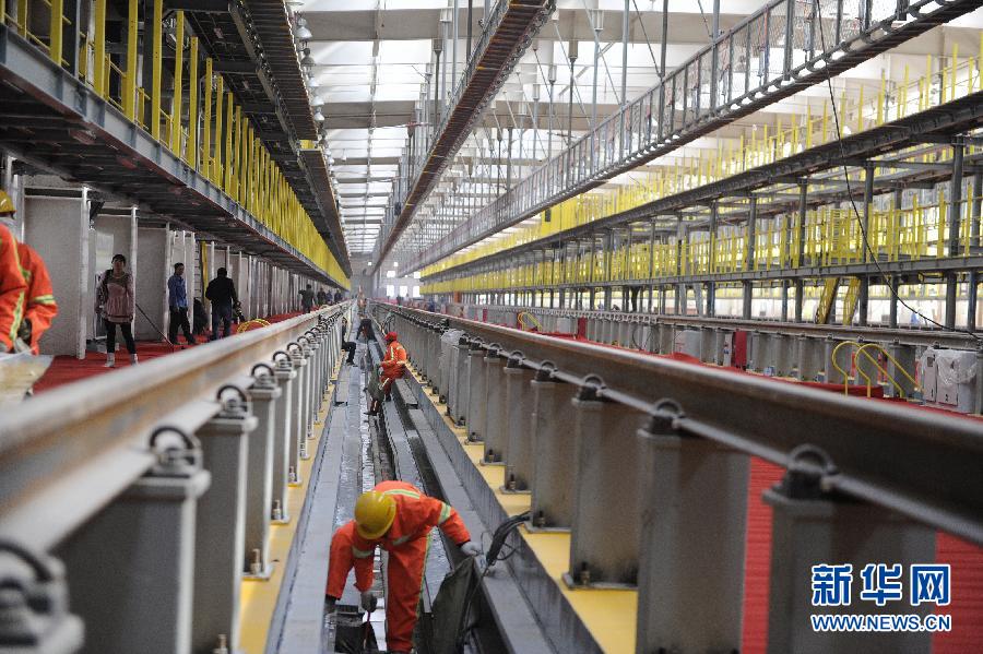 10月15日,呼和浩特东站动车所内,工作人员在清理卫生,为动车调试做准备。当日,呼(呼和浩特)张(张家口)客运专线呼和浩特东站动车所的工作人员进行单体调试。呼张客运专线将是内蒙古首条高铁铁路,预计2018年完工。作为客运专线的核心配套工程,呼和浩特东站动车所主体已完工,目前进入单体安装调试阶段,预计2014年年底具备动车检修能力。新华社记者邵琨摄