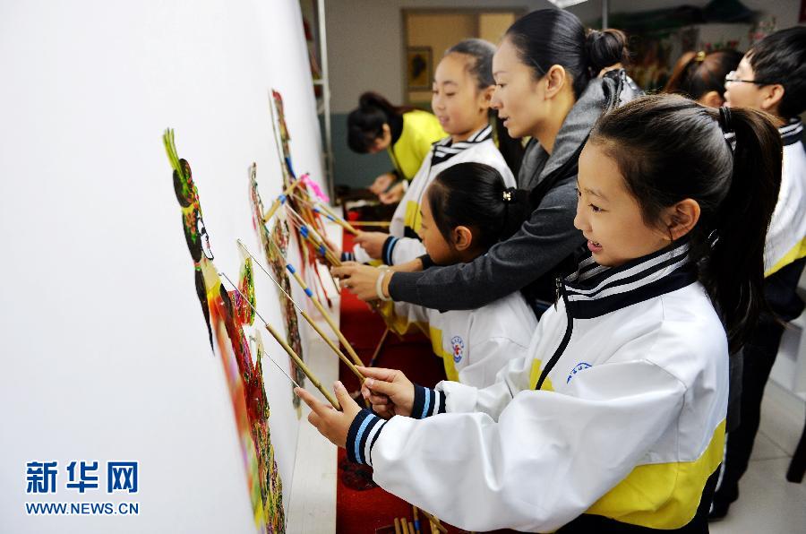 10月23日,河北省滦县龙山初级学校的学生在皮影老师的指导下表演皮影戏。近年来,河北省唐山市滦县龙山初级学校在校园开设唐山皮影技艺课,教授学生们学习制作皮影和表演皮影戏的技巧,激发学生学习传统文化、传承当地非物质文化遗产的热情。新华社记者 朱旭东 摄
