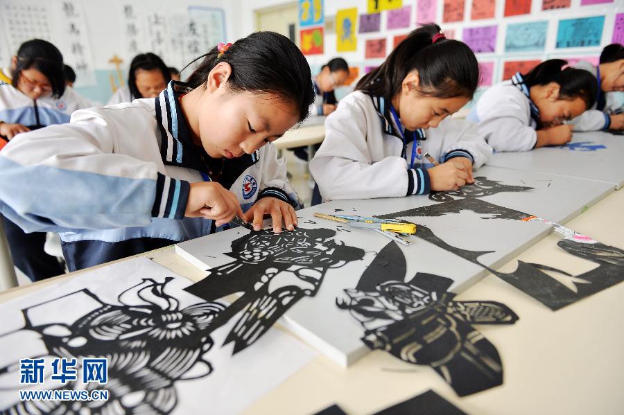 10月23日,河北省滦县龙山初级学校的学生在皮影技艺课上学习制作表演道具。近年来,河北省唐山市滦县龙山初级学校在校园开设唐山皮影技艺课,教授学生们学习制作皮影和表演皮影戏的技巧,激发学生学习传统文化、传承当地非物质文化遗产的热情。新华社记者 朱旭东 摄