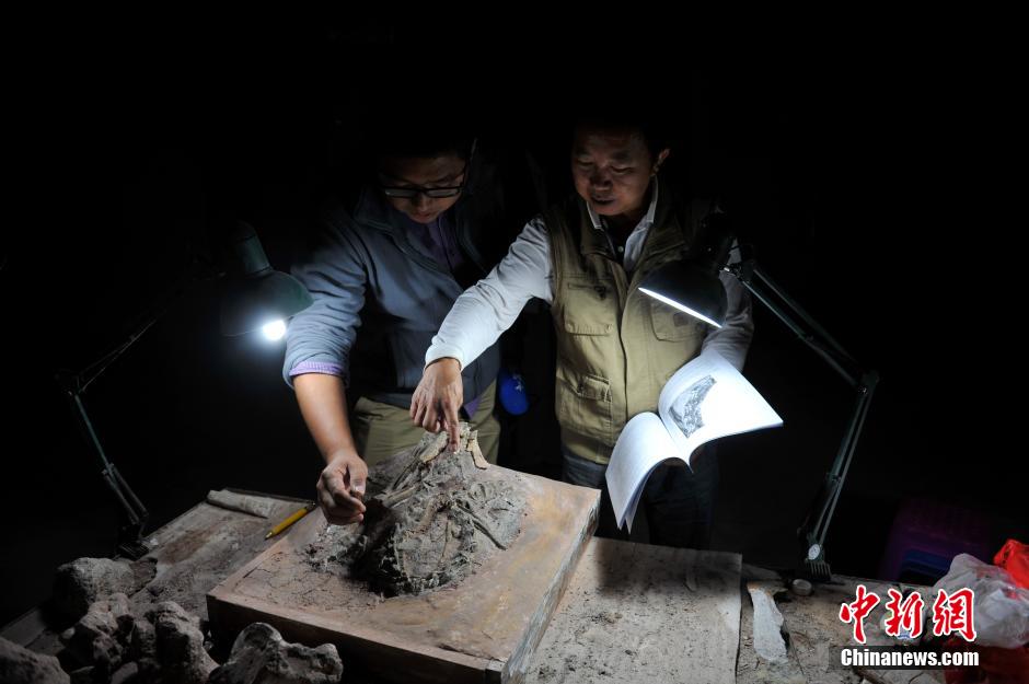 10月23日,工作人员向记者介绍化石。近日,在云南禄丰早侏罗世地层中发现了一具保存较好的腔骨龙类恐龙新属种,禄丰盘古盗龙。这是腔骨龙类化石在亚洲的首次发现。中新社发 刘冉阳 摄