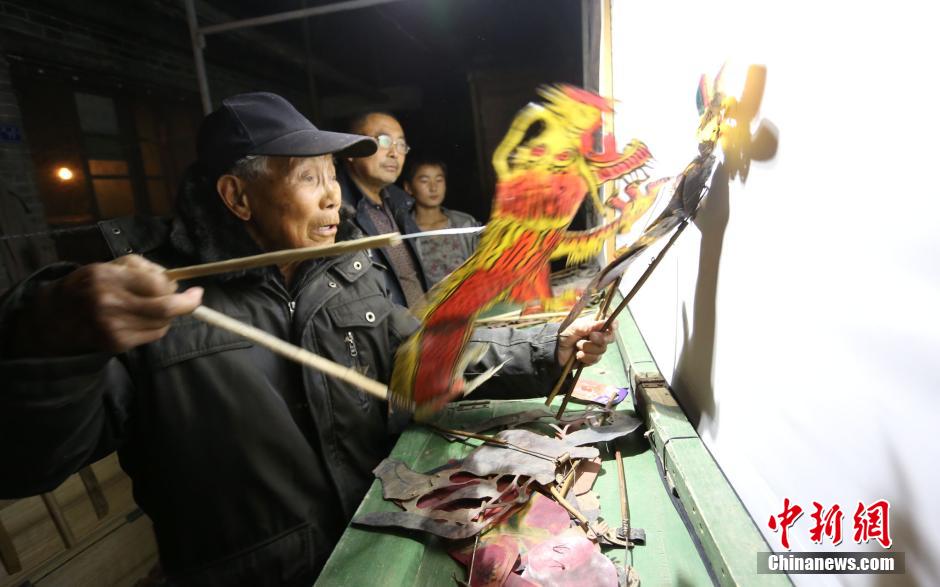 图为11月2日,百岁五彩皮影老艺人吕心哲和他的儿孙们正在表演五彩皮影戏。 杨正华 摄
