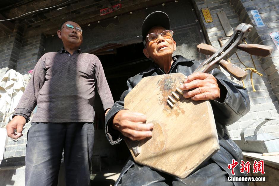图为11月2日,百岁五彩皮影老艺人吕心哲在弹奏一把传承了几代人的古老大弦。 杨正华 摄