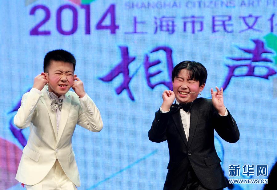 11月7日,小演员在相声大会上表演相声《拼爷》。当日,2014年上海市民文化节市民相声大会在沪上开始展演,共有25个团队和个人共28个节目参加为期4天的展演活动。本次相声大会几乎网罗了活跃在上海舞台上的所有民间相声团队,田耘社、品欢相声会馆、乐透社、喜乐汇、九乐堂等新老相声社团汇聚一堂。在展演节目中,绝大部分演员的年龄集中在二三十岁,几乎成了年轻人的聚会。新华社记者 任珑摄