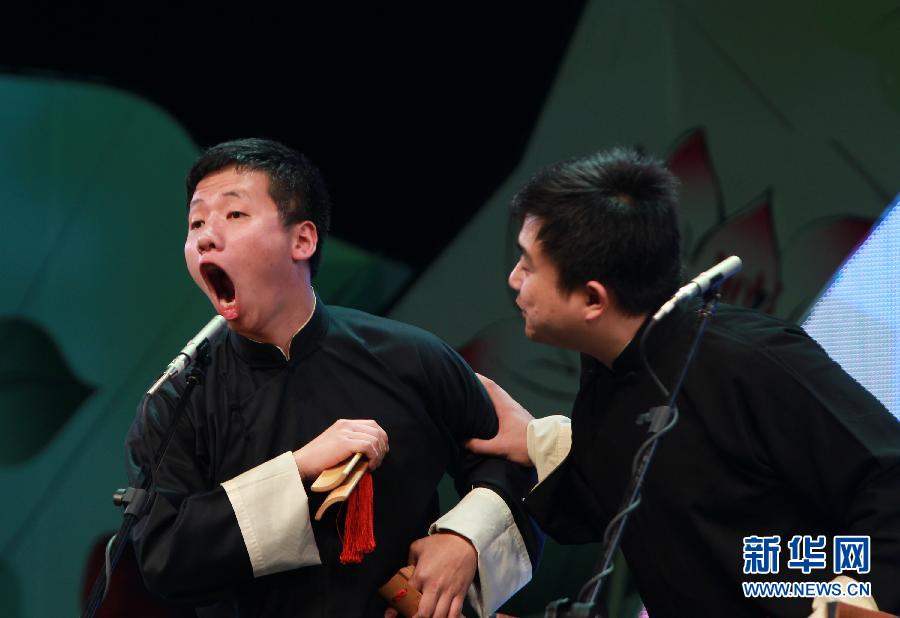 11月7日,来自徐汇区田林曲艺社的演员在相声大会上表演相声《新鲜不新鲜》。当日,2014年上海市民文化节市民相声大会在沪上开始展演,共有25个团队和个人共28个节目参加为期4天的展演活动。本次相声大会几乎网罗了活跃在上海舞台上的所有民间相声团队,田耘社、品欢相声会馆、乐透社、喜乐汇、九乐堂等新老相声社团汇聚一堂。在展演节目中,绝大部分演员的年龄集中在二三十岁,几乎成了年轻人的聚会。新华社记者 任珑摄