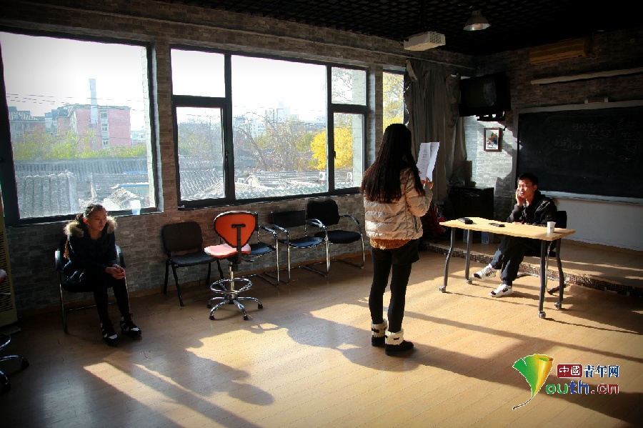 小蓉告诉记者,初中时她学了三年的国标,后来因练习时受伤便中断了。今年高三了,希望能通过艺考,考上一个好学校。她说今天上午两个小时的台词课上完之后,马上要赶去另一个学校测试,晚上再赶回来。(中国青年网记者孟畅摄)